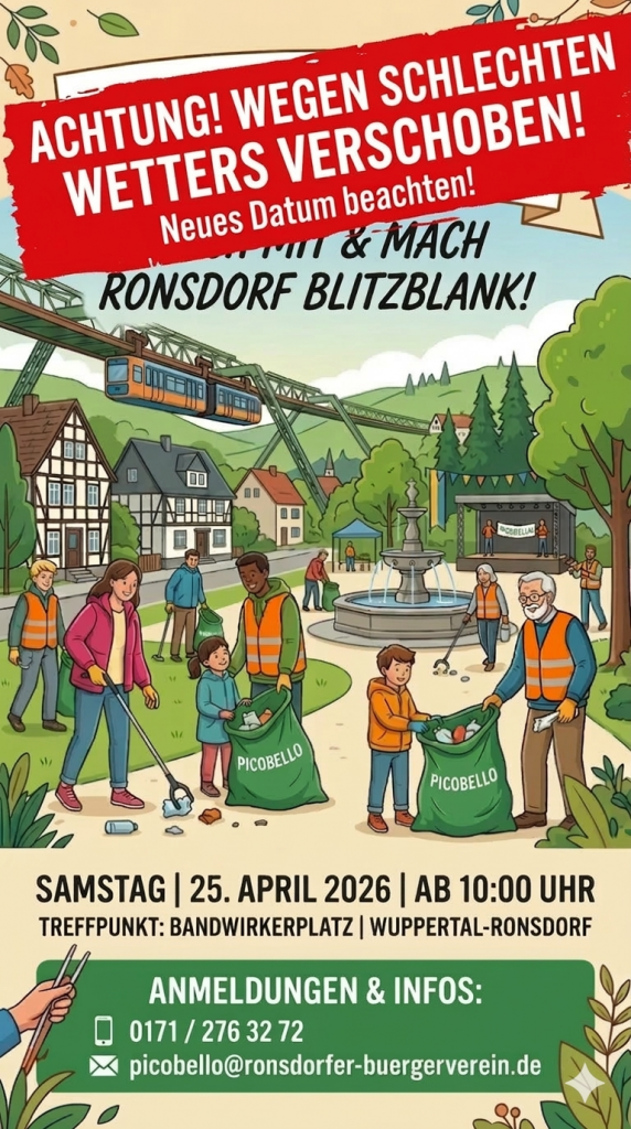 Für ein sauberes Ronsdorf. Vom Bandwirkerplatz aus startet der Ronsdorfer Heimat- und Bürgerverein am 14.März ab 10:00 wieder eine große Putzaktion, bei denen viele Bürger und Vereine vor dem Frühling unsere Parks, Gärten, Wege und Plätze säubern. Ihre Anmedung wird freundlich unter picobello@ronsdorfer-buergerverein.de oder unter 0171/2763272 erwartet. Bitte teilen Sie uns Mitgliederanzahl Ihrer Gruppe und Ihren gewünschten Einsatzort mit.